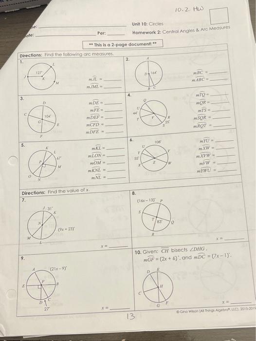 Hwk 10 2 2 Docx Pdf Name Laci White Unit 10 Date Circles Homework 2 Bell Central Angles Arc Measures Arc Lengths This Is A 2 Page Course Hero
